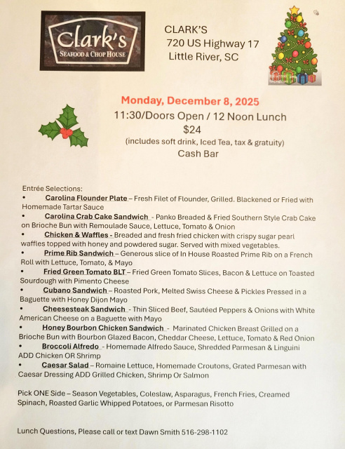 Members of the Lunch Bunch Committee scout eateries in the areas from North of Wilmington, south to Myrtle Beach in order to select a monthly venue that will introduce you to someplace new or reacquaint you with an old favorite.